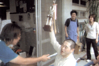 その中でも1番盛り上がったのが、利用者と職員の混合リレーでした。 あめ食い、グルグルバットなどの障害物リレーで、職員の粉まみれの顔、目がまわり真っすぐ走れない姿にみんな大爆笑でした!!