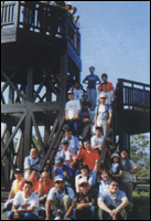 今回の山は南房総市にある富山です。千葉県にも沢山の山がありますが、富山は始めから登り坂が長く急で、すぐに息が上がってしまいます。登山入り口には杖が置いてあるのですが、それがないと、とても辛くすぐに足にきてしまいます。しかも気温が高く、皆さん汗びっしょりで歩きました。ゆっくり休憩しながら2時間半ぐらいで頂上に到着です。頂上には展望台があり、そこから東京湾を一望でき、天気の良い日は富士山、さらに大島まで見られます。あいにくその日はガスが掛かっていて富士山、大島までは見られませんでしたが、みんなが展望台に上り、下界の景色を楽しんでいました。