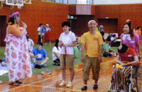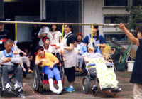 当日は暑さ対策の為数十台の扇風機や多量の水分と氷を用意して臨みました。開会式では施設長・行事担当は、仮装で現れ、第一競技の仮装『こ〜でね〜と!?』に繋ぎました。 第二競技は、皆が楽しみにしていた『パン食い』です。一応一人一個と言っていましたが、目の前にある沢山のパンには 自然と足が動き、口で取れない人は手で取り、すぐに袋を開け、美味しそうに食べていました。