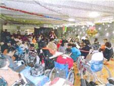 やって参りました。毎年恒例クリスマス会!車椅子の利用者が大半を占めるあいらいの郷にとって、利用者が参加しやすいこの行事は、一番盛り上がるイベントだと思います。