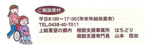 現在では、当法人ご利用者様に留まらず、木更津市を中心に近隣4市にお住まいの障害をお持ちの方や、そのご家族のご相談を賜っております。
